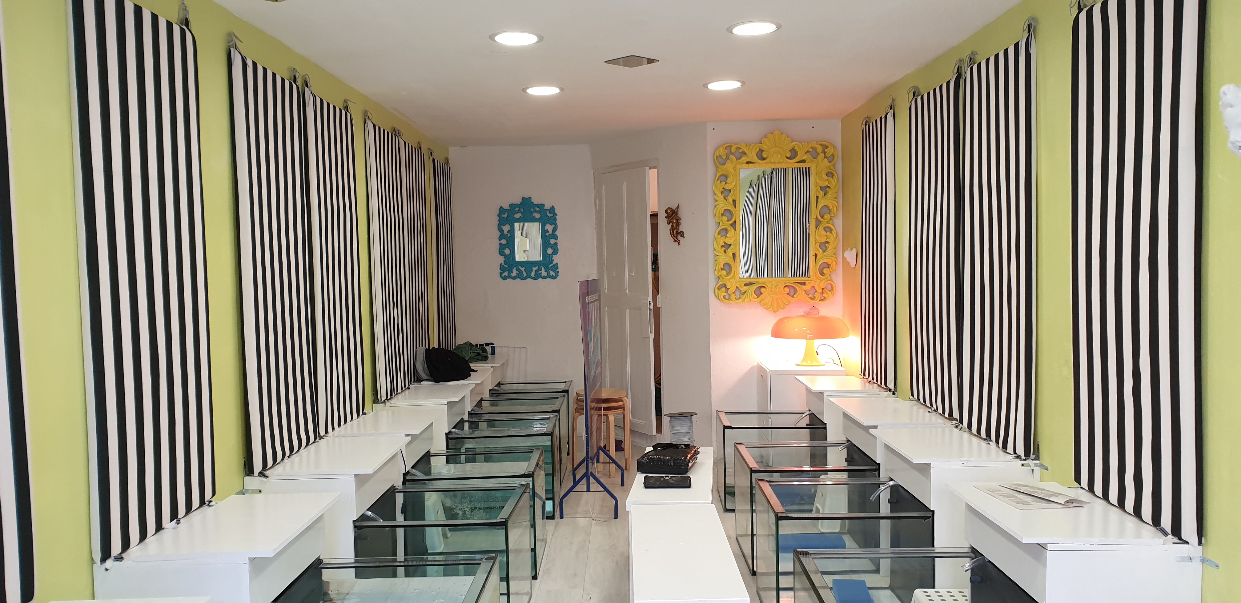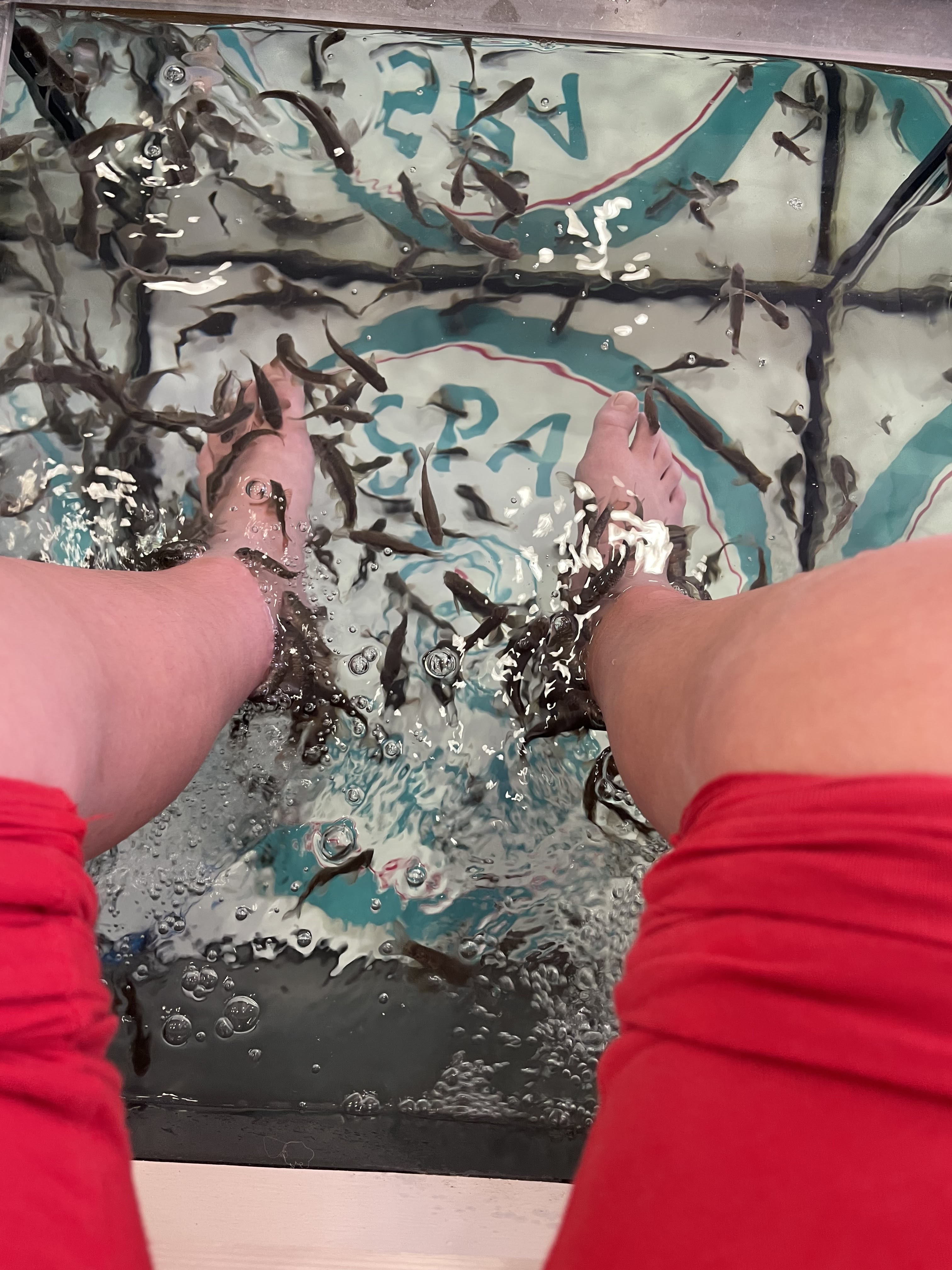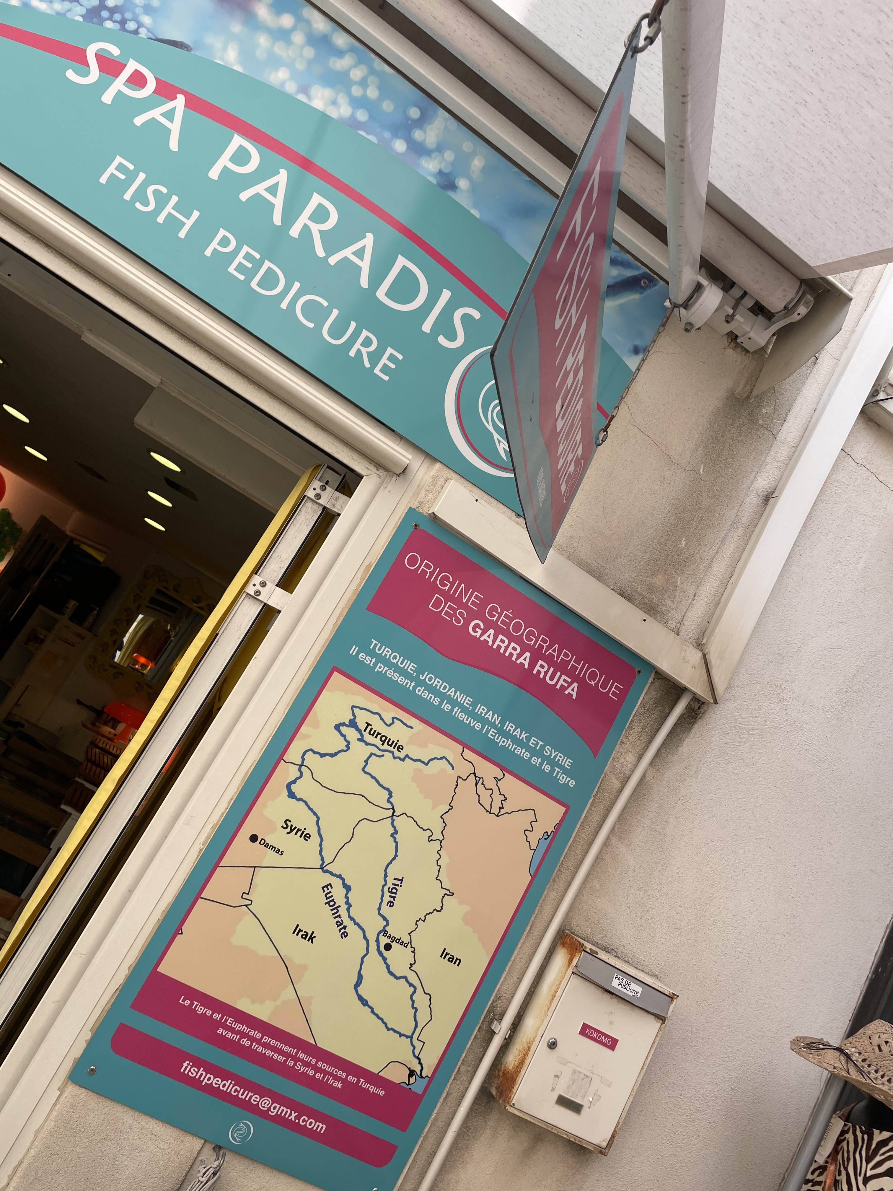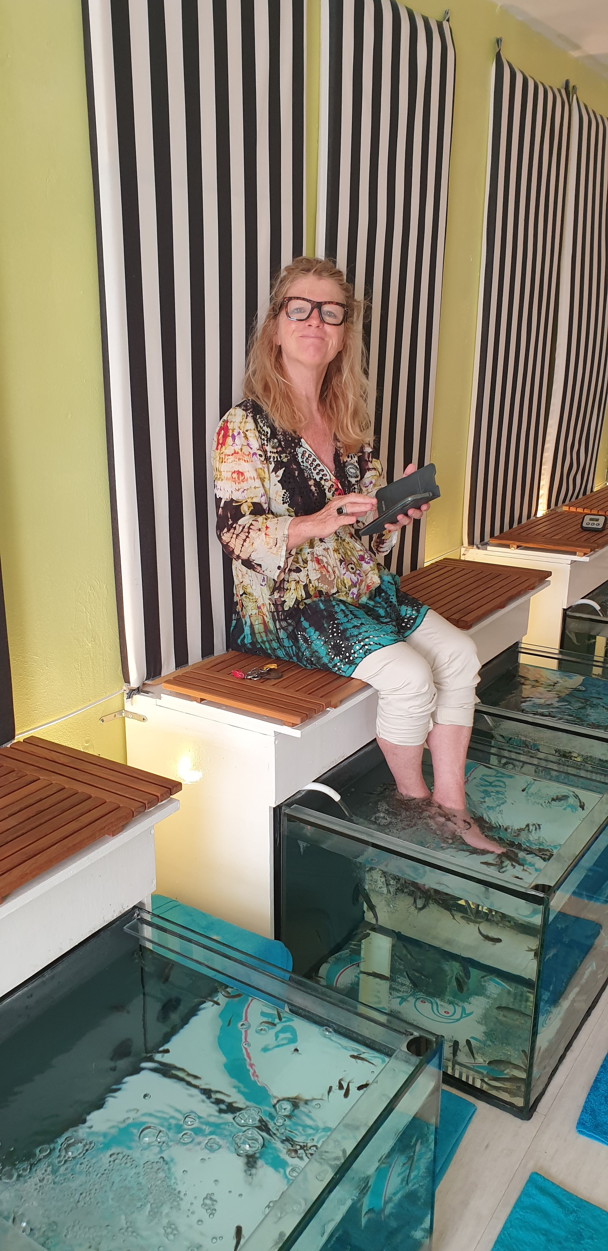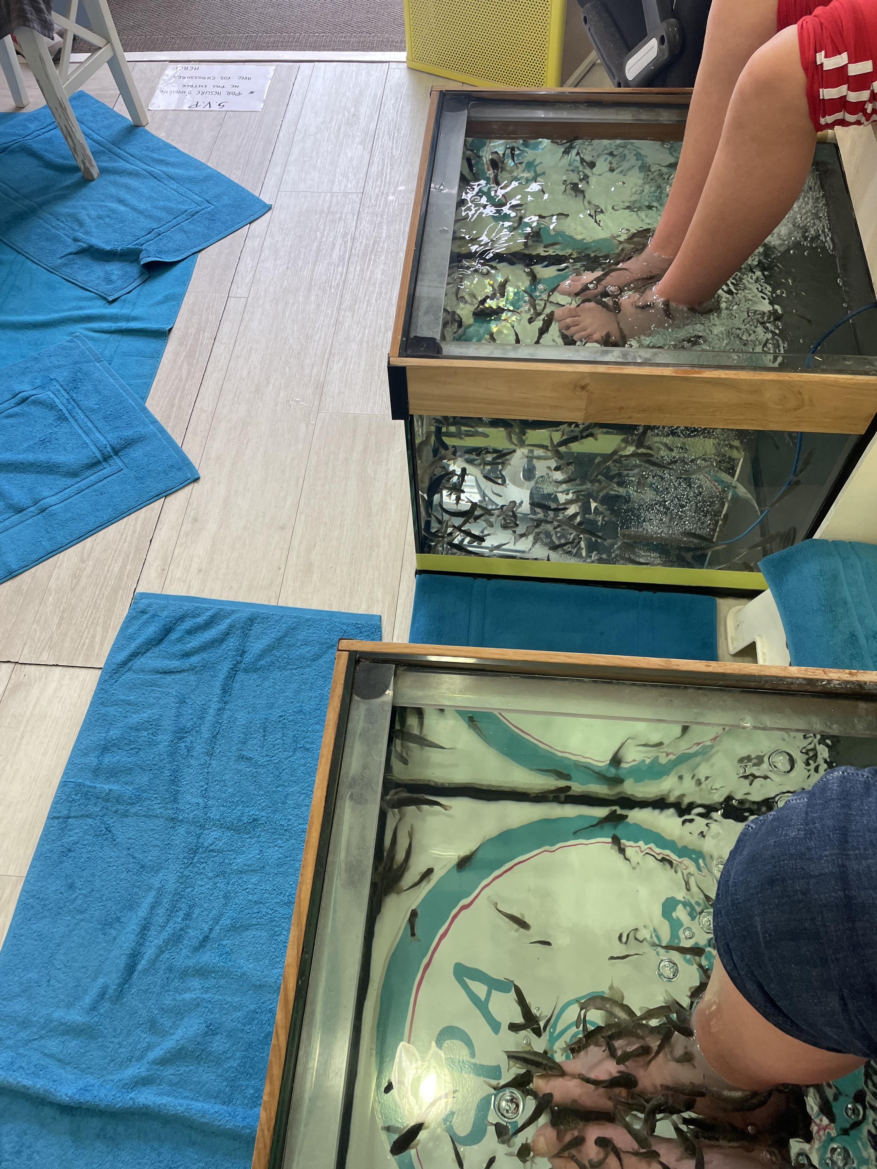 Vacances de Pâques aux Saintes-Maries-de-la-Mer et parmi un des lieux interdits de ce lieu merveilleux nous sommes attirés par la fish pédicure, aussi parce qu'au prix de 13 € la demi-heure ça ne prend pas trop temps loin de notre voyage. Le propriétaire est vraiment très gentil : il enlève nos chaussures à l'entrée, met nos pieds dans une baignoire où il nous lave soigneusement les pieds, puis en marchant sur des tapis spéciaux nous allons jusqu'à notre baignoire et... il nous explique comment faire : d'abord on plonge un pied, lentement puis l'autre, on met notre minuteur dessus et tout commence... première fois pour nous... tant de rires 😝🤣 du chatouillement des douces pincées du poisson... vraiment fantastique expérience. Convient également aux enfants : aussi bien pour leurs pieds que pour leurs mains que le propriétaire lave en premier. Félicitations !! 👏